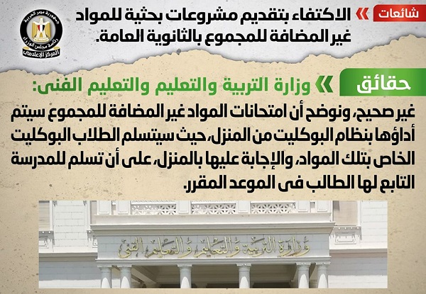 كشف مركز المعلومات بمجلس الوزراء عن صحة الاخبار المتداولة بشأن الاكتفاء بتقديم مشروعات بحثية للمواد غير المضافة الى المجموع للثانوية العامة 2020.