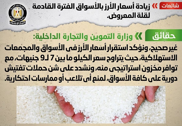كشف مركز المعلومات بمجلس الوزراء عن صحة الاخبار المتداولة بشأن زيادة اسعار الارز بالاسواق الفترة المقبلة بداية من اول يوليو لقلة المعروض.