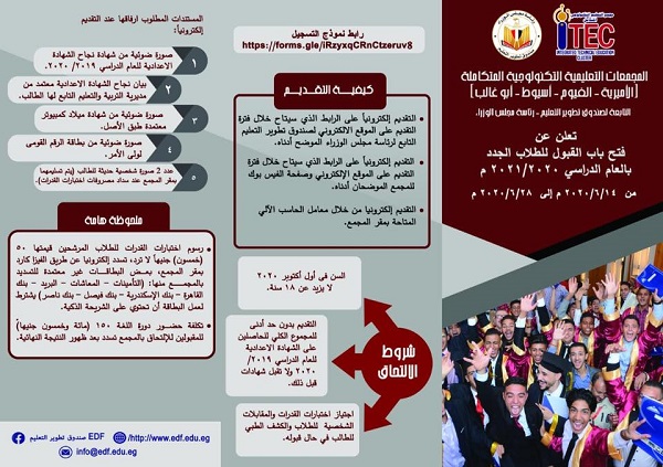 أعلن صندوق تطوير التعليم، التابع لرئاسة مجلس الوزراء، عن فتح باب قبول الطلاب الحاصلين على الإعدادية الحديثة في المجمعات التعليمية التكنولوجية المتكاملة بالأميرية، والفيوم، وأسيوط، وأبو غالب، للعام الدراسي الجديد 2020 - 2021.