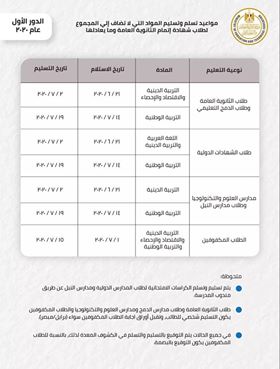 اعلنت وزارة التربية والتعليم الجدول المعدل لمواعيد تسلم وتسليم امتحانات المواد التي لا تضاف إلي المجموع لطلاب شهادة إتمام الثانوية العامة وما يعادلها.