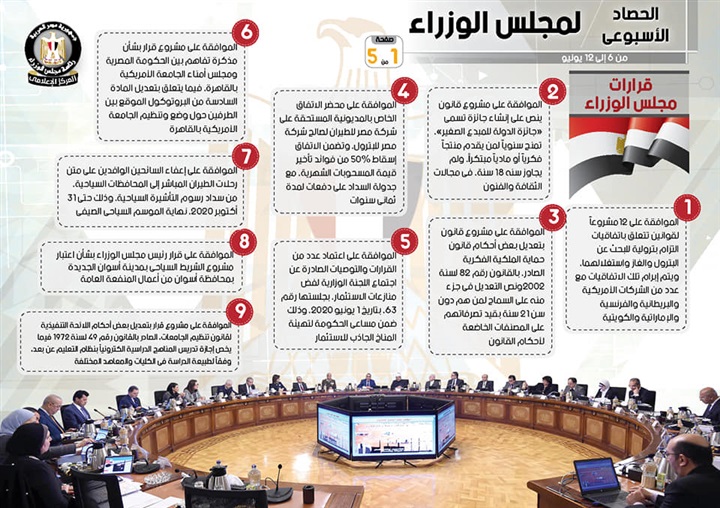 وجاء في الإنفو جراف أنه تمت الموافقة على عدد من القرارات، تشمل الموافقة على 12مشروعاً لقوانين تتعلق باتفاقيات التزام بترولية للبحث عن البترول والغاز واستغلالهما، ويتم إبرام تلك الاتفاقيات مع عدد من الشركات الأمريكية والبريطانية والفرنسية والإماراتية والكويتية، وكذلك الموافقة على مشروع قانون ينص على إنشاء جائزة تسمى "جائزة الدولة للمبدع الصغير"، تمنح سنوياً لمن يقدم منتجاً فكرياً أو مادياً مبتكراً، ولم يجاوز سنه 18 سنة، في مجالات الثقافة والفنون، فضلاً عن الموافقة على مشروع قانون بتعديل بعض أحكام قانون حماية الملكية الفكرية الصادر، بالقانون رقم 82 لسنة 2002ونص التعديل في جزء منه على السماح لمن هم دون سن 21 سنة بقيد تصرفاتهم على المصنفات الخاضعة لأحكام القانون، بجانب الموافقة على مشروع قرار بشأن مذكرة تفاهم بين الحكومة المصرية ومجلس أمناء الجامعة الأمريكية بالقاهرة، فيما يتعلق بتعديل المادة السادسة من البروتوكول الموقع بين الطرفين حول وضع وتنظيم الجامعة الأمريكية بالقاهرة.