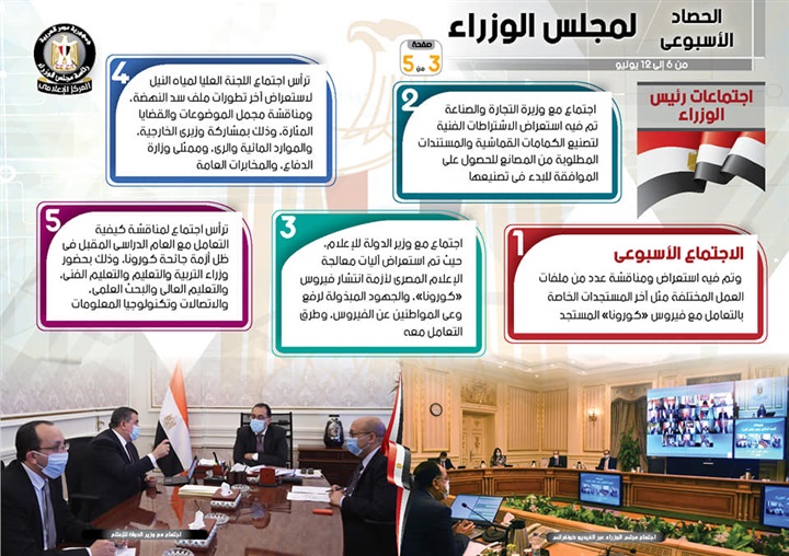 نشر المركز الإعلامي لمجلس الوزراء، إنفوجرافاً سلط من خلاله الضوء على الحصاد الأسبوعي لمجلس الوزراء، وذلك خلال الفترة من 6 حتى 12 يونيو 2020، والذي تضمن الموافقة على عدد من القرارات، فضلاً عن الاجتماعات واللقاءات التي عقدها الدكتور مصطفى مدبولي، رئيس مجلس الوزراء، بالإضافة إلى ما قام به سيادته من أنشطة.