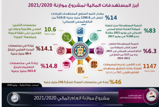 نشر مركز معلومات مجلس الوزراء، إنفوجراف، أوضح خلاله أن وزارة المالية وضعت العديد من المستهدفات في الموازنة العامة للعام المالي 2020 - 2021، فبجانب معدل النمو السنوي والعمل على خفض العجز الكلي للموازنة، رفعت الوزارة من مخصصات الصحة والبحث العلمي والتأمين الصحي وخطة مواجهة فيروس كورونا.