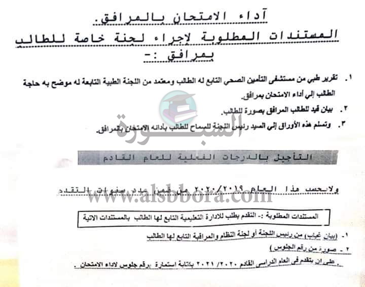 1- تقرير طبى من مستشفى التأمين الصحى التابع له الطالب ومعتمد من اللجنة الطبية التابعة له موضحا به حاجة الطالب الى اداء الامتحان بمرافق.