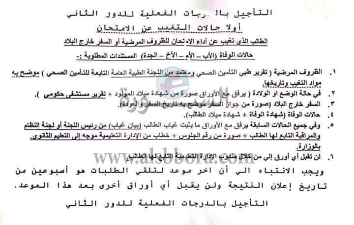6- وفى جميع الحالات السابقة يرفق مع الاوراق ما يثبت غياب الطالب من رئيس اللجنة او لجنة النظام والمراقبة التابع لها الطالب وصورة من رقم الجلوس وخطاب من الادارة التعليمية موجه الى التعليم الثانوى.