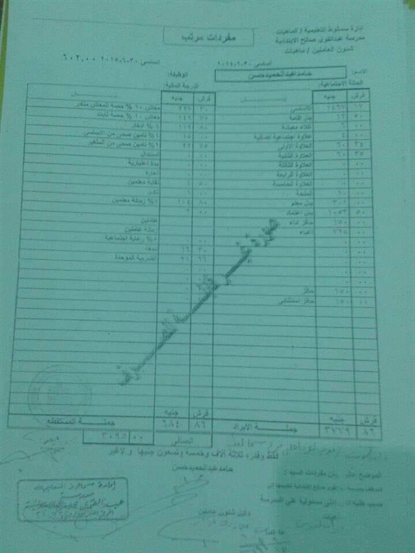 نشر احد المعلمين على مواقع التواصل الاجتماعى مفرادات راتبة بعد ان قضى 29 عاما فى خدمة التعليم