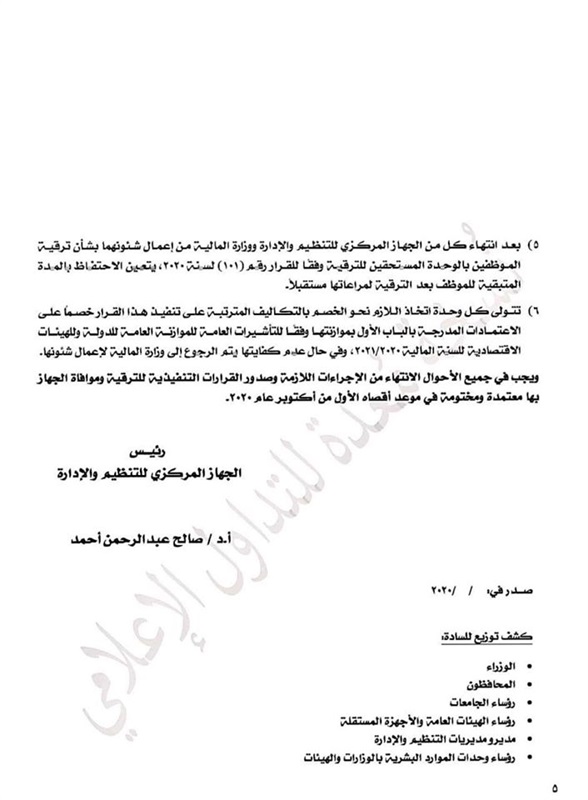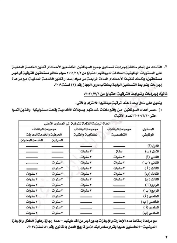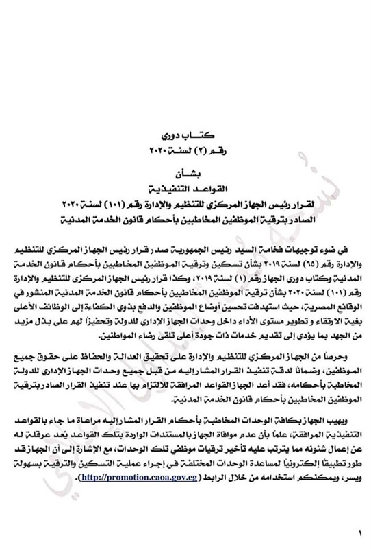 وشدد الجهاز على أنه يجب في جميع الأحوال الانتهاء من الإجراءات اللازمة وصدور القرارات التنفيذية للترقية وموافاة الجهاز بها معتمدة ومختومة في موعد أقصاه الأول من أكتوبر عام 2020.