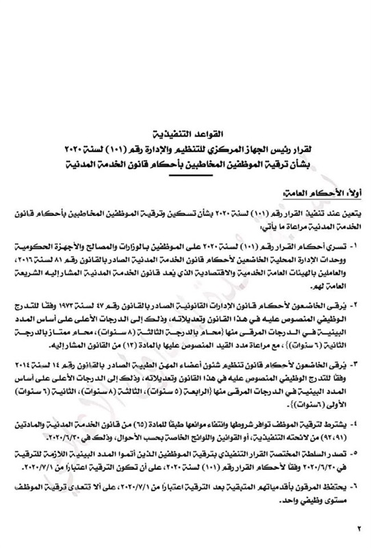 أصدر الدكتور صالح الشيخ رئيس الجهاز المركزي للتنظيم والإدارة كتاب دوري رقم (2) لسنة 2020 بشأن القواعد التنفيذية لقــرار رئيـس الجهاز المركزي للتنظيم والإدارة رقـم (101) لسنـة 2020 الصـادر بترقية الموظفين المخاطبين بأحكام قانون الخدمة المدنية، تسترشد به الوحدات الإدارية عند تنفيذ الإجراءات اللازمة للترقية .