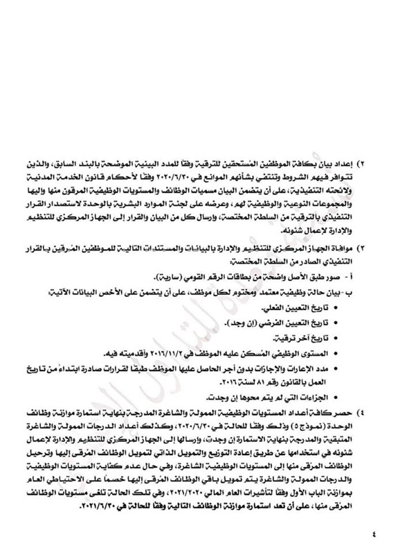 وتقوم الوحدة بموافاة الجهاز المركزي للتنظيم والإدارة بالبيانات والمستندات اللازمة والتي حددها في الكتاب الدوري المشار إليه للموظفين المُرقين بالقرار التنفيذي الصادر من السلطة المختصة، كما ينبغي حصر كافة أعداد المستويات الوظيفية الممولة والشاغرة المدرجة بنهاية استمارة موازنة وظائف الوحدة (نموذج 5) وذلك وفقًا للحالة في 30/6/2020، وكذلك أعداد الدرجات الممولة والشاغرة المتبقية والمدرجة بنهاية الاستمارة إن وجدت، وإرسالها إلى الجهاز لإعمال شئونه في استخدامها عن طريق إعادة التوزيع والتمويل الذاتي لتمويل الوظائف المُرقى إليها وترحيل الوظائف المرُقى منها إلى المستويات الوظيفية الشاغرة، وفي حال عدم كفاية المستويات الوظيفية والدرجات الممولة والشاغرة يتم تمويل باقي الوظائف المُرقى إليها خصمًا على الاحتياطي العام بموازنة الباب الأول وفقًا لتأشيرات العام المالي 2020/2021، وفي تلك الحالة تُلغى مستويات الوظائف المرُقى منها، على أن تُعد استمارة موازنة الوظائف التالية وفقًا للحالة في 30/6/2021.