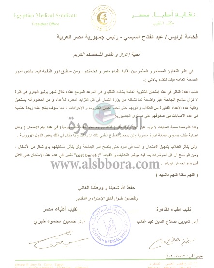 عاجل.. الاطباء تخاطب رئيس الجمهورية والحكومة لعدم اجراء امتحانات الثانوية العامة.. مستند