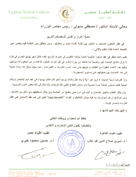 خاطبت النقابة العامة للأطباء برئاسة الدكتور حسين خيري، ونقيب أطباء القاهرة الدكتورة شيرين غالب،أربع جهات رسمية وهم؛ رئيس الجمهورية ورئيس الوزراء ورئيس مجلس النواب ووزير التربية والتعليم، لإعادة النظر في عقد امتحان الثانوية العامة بشكله التقليدي في الموعد المزمع عقده خلال شهر يونيو الجاري.