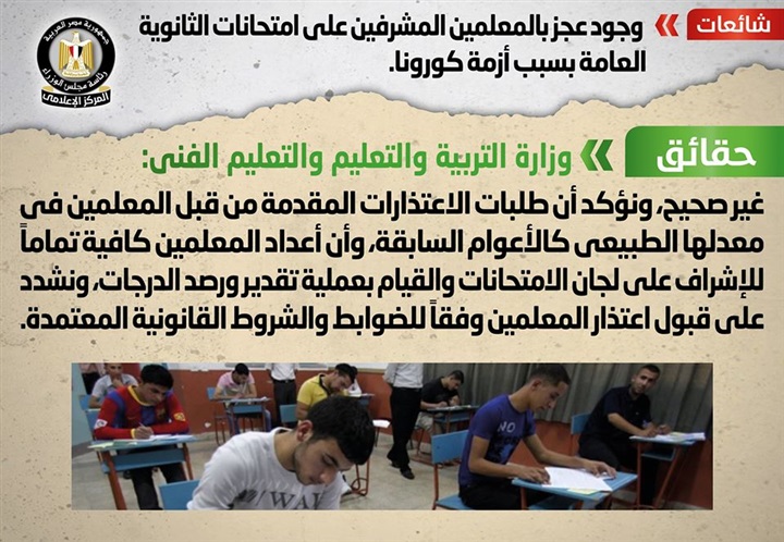 كشف مركز المعلومات بمجلس الوزراء عن حقيقة الاخبار المتداولة بشأن عجز المعلمين المشرفين على امتحانات الثانوية العامة للعام الدراسى الحالى 2020/2019، والتى سوف تنطلق بعد غد الاحد وتستمر حتى 21 يوليو المقبل.
