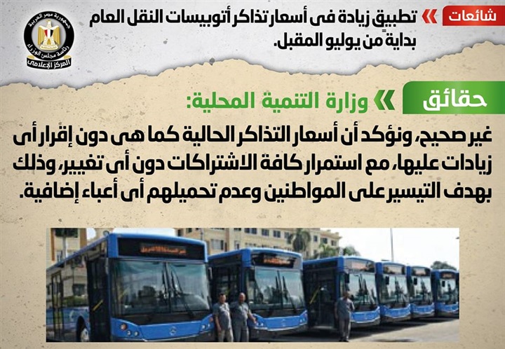 وقد قام المركز الإعلامي لمجلس الوزراء بالتواصل مع وزارة التنمية المحلية، والتي نفت تلك الأنباء، مُؤكدةً أنه لا صحة لتطبيق أي زيادة في أسعار تذاكر أتوبيسات النقل العام بدايةً من يوليو المقبل، مُوضحةً أن أسعار التذاكر الحالية كما هي تماماً دون إقرار أي زيادات عليها، مع استمرار كافة الاشتراكات دون أي تغيير، وذلك بهدف التيسير على المواطنين وعدم تحميلهم أي أعباء إضافية.