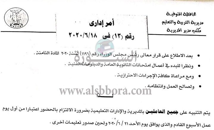 اصدرت مديرية التربية والتعليم بمحافظة المنوفية، امر اداريا الى جميع المعلمين المشاركين فى اعمال امتحانات الثانوية العامة للعام الدراسى الحالى 2020/2019، بالانتظام بمواعيد عملهم، اما بالنسبة لغير المشاركين فى امتحانات الثانوية العامة فيطبق عليهم قرار رئيس مجلس الوزراء رقم 1196.