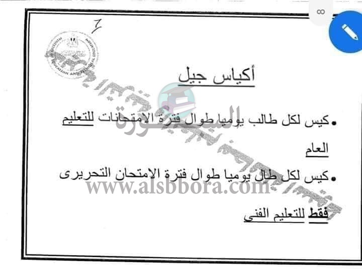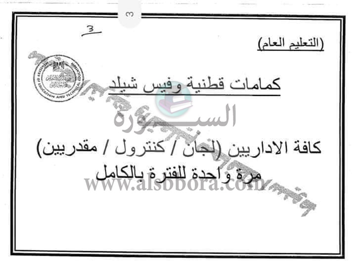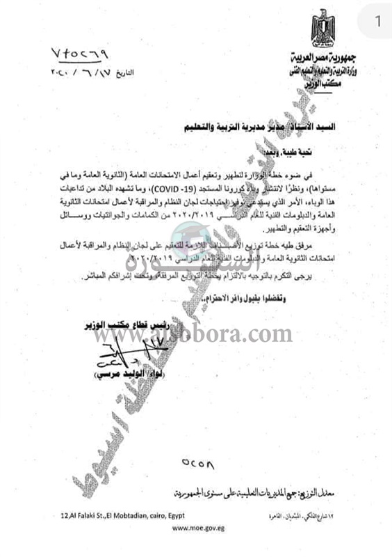 واضاف الوزارة فى الخطاب " أنه في ضوء خطة الوزارة لتطهير وتعقيم أعمال امتحانات الثانوية العامة والدبلومات الفنية ، ونظرا لانتشار فيروس كورونا ، وما تشهده البلاد من تداعيات هذا الوباء، تقرر توفير الاحتياجات اللازمة لاتخاذ الإجراءات الاحترازية اللازمة داخل لجان النظام والمراقبة لأعمال امتحانات الثانوية العامة من الكمامات والجوانتيات و وسائل وأجهزة التعقيم والتطهير".
