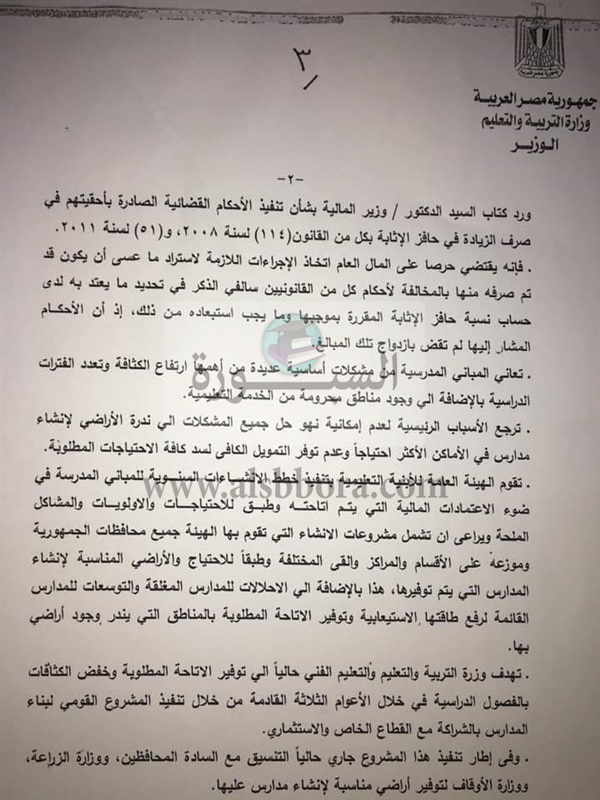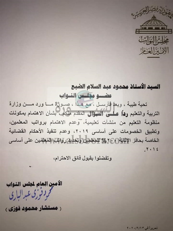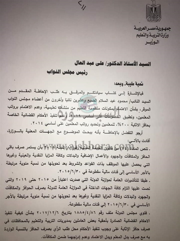 وكان النائب محمود عبدالسلام الضبع نائب قنا قد وحه سؤالا الى الدكتور طارق شوقي وزير التربية والتعليم عن عدم الاهتمام برواتب المعلمين وتطبيق الخصومات على اساسي 2019، وعدم تنفيذ الاحكام القضائية الخاصه بحافز الاثابة 200 ? وتحديد رواتب المعلمين علي اساسي 2014.