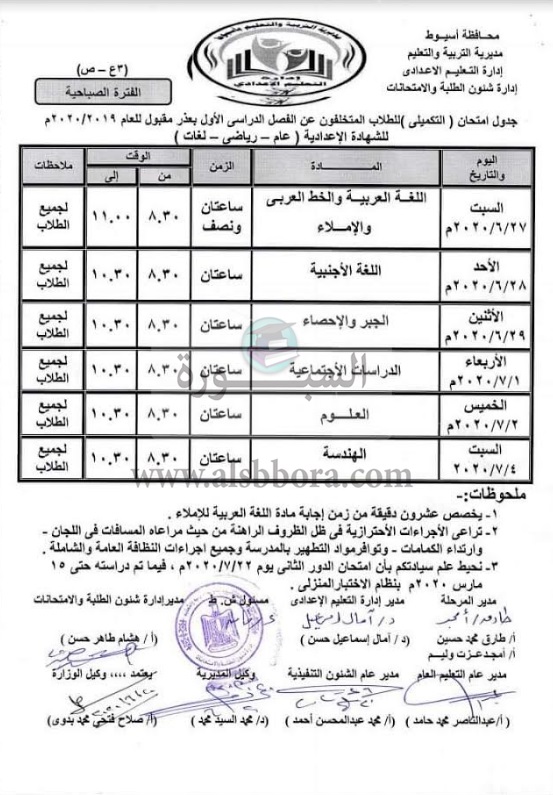 قامت مديربه التعليم بمحافظه اسبوط بشر الجدول التكميلي لطلاب الشهادة الاعدادية المتخلفون بعذر فى التيرم الأول للعام الدراسى 2020/2019.