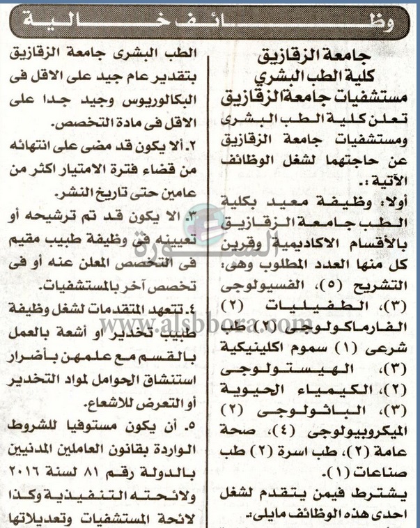 أعلنت جامعة الزقازيق وظائف جديدة لاعضاء هيئة التدريس "من المعيدين إلي أستاذ" في 13 تخصص علما بأن أخر موعد للتقديم 30 يونيو وفقا لنص الإعلان التالي:-