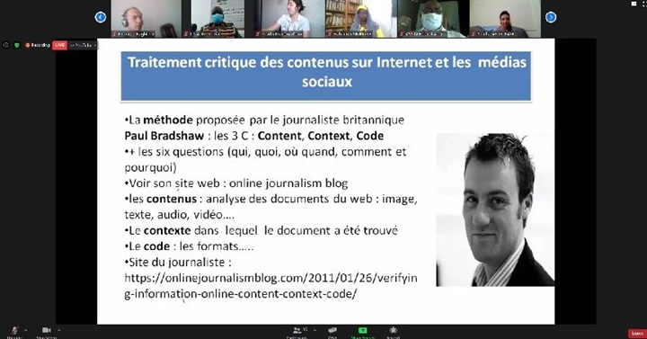 وعرض المحاضر الدكتور الصادق الحمامي لمعالم البيئة التي تنشأ فيها الأخبار الكاذبة والمضللة والشائعات، والأدوات التي يلجأ إليها صناع الأخبار الكاذبة لتضليل الرأي العام، متناولا بالشرح طرق التحقق والتحري عن المعلومات والصور والفيديو عبر محركات البحث. مؤكدا أهمية تنمية مهارات الإعلاميين في مجال التطبيقات التقنية والتكنولوجيا واستعانته بزملائه في الأقسام التقنية التحقق من المضامين البصرية قبل نشرها.