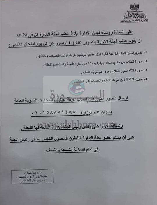 وأكدت الوزارة فى خطاب لها الى جميع رؤساء لجان امتحانات الثانوية العامة ابلاغ عضو لجنة الادارة كل فى قطاعه ان يقوم عضو لجنة الادارة بتصوير 4 صور عن كل يوم امتحان كالتالى: