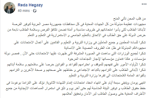 وتابع نائب الوزير عبر صفحته الشخصية: شكرا للمعلمين و جميع العاملين فى وزارة التربية و التعليم و القائمين على أعمال الامتحانات على مجهوداتكم المبذولة فى ظل هذه الظروف العصيبة على الانسانية وشكرا لجميع الوزارات التى ساهمت فى الصورة المشرفة التى ظهرت عليها الامتحانات حتى الأن فمصر دولة مؤسسات و هكذا تتعاون مؤسساتها لإنجاز النجاحات المرجوة
