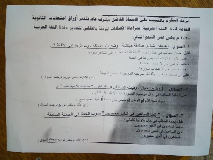 اعلنت وزارة التربية والتعليم التعديلات التي تمت علي نموذج امتحان اللغه العربيه للثانويه العامه وطالبت الوزارة جميع المصححين مراعاتها عند التصحيح