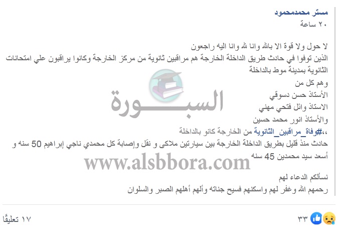وقال المعلم محمود محمد إن الذين توفوا في حادث طريق الداخلة الخارجة هم مراقبين ثانوية من مركز الخارجة وكانوا يراقبون علي امتحانات الثانوية بمدينة موط بالداخلة وهم كل من: