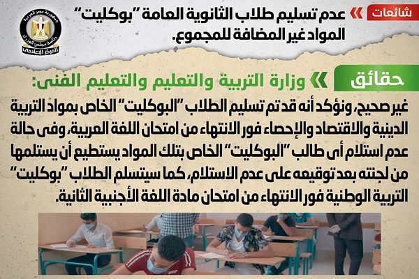 كشف مركز المعلومات بمجلس الوزراء عن حقيقة الاخبار المتداولة بشأن عدم تسليم طلاب الثانوية العامة بوكليت المواد غير المضافة للمجموع.