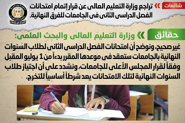 نفت وزارة التعليم العالى فى تقرير رصد الشائعات للحكومة، ما تردد من أنباء بشأن تراجع وزارة التعليم العالي عن قرار إتمام امتحانات الفصل الدراسي الثاني في الجامعات للفرق النهائية، مؤكدةً أنه لا صحة لتراجع الوزارة عن قرار إتمام امتحانات الفصل الدراسي الثاني في الجامعات للفرق النهائية.