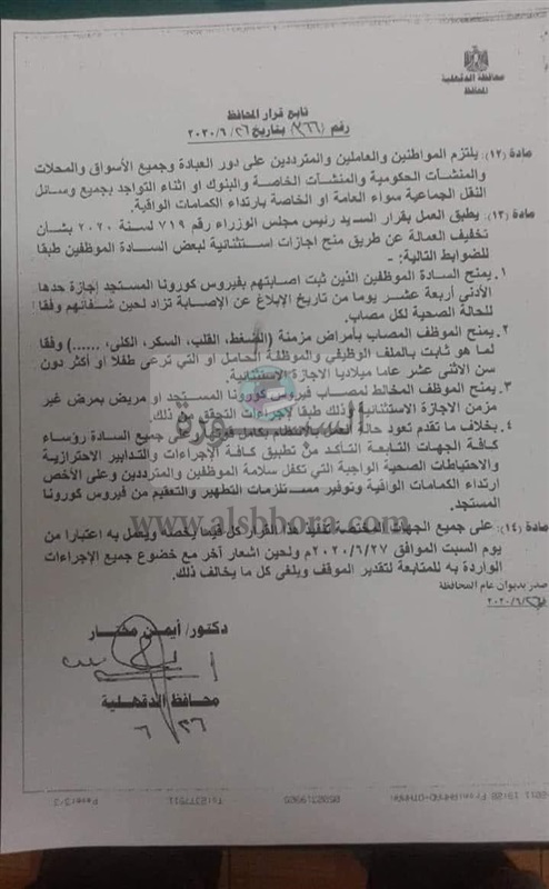 اصدر الدكتور ايمن مختار، محافظ الدقهلية، قرارا باستمرار الاجازات الاستثنائية للعاملين بالهيئات والمصالح الحكومية وذلك لتحفيف العمالة ووفقا للضوابط التالية:-