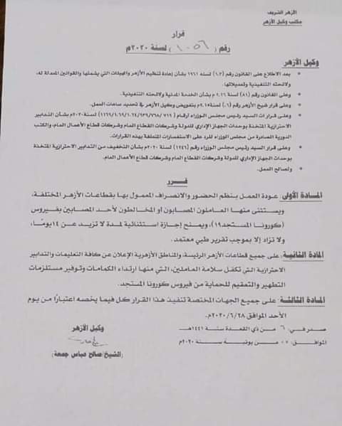 ونص قرار وكيل الأزهر رقم ( 1056) لسنة 2020 م على الآتى: