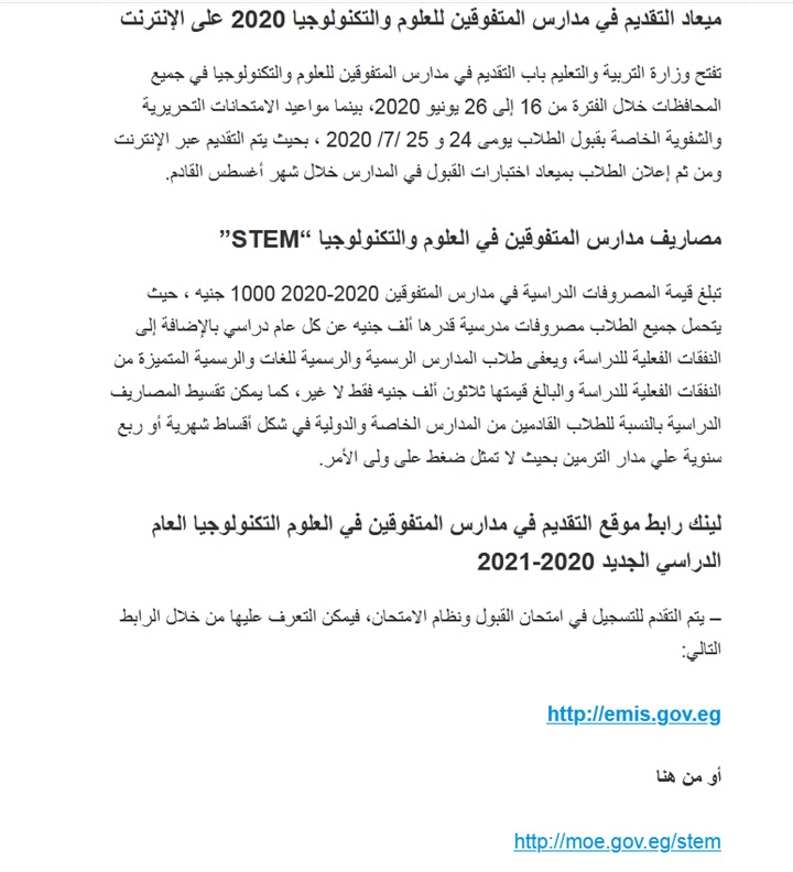 وتضمن إعلان الوزارة درجات مجموع التقديم في مدرسة المتفوقين في القاهرة وعين شمس وجميع