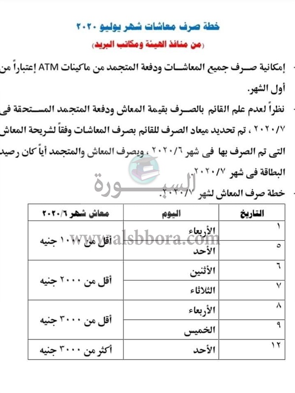 اما بالنسبة لاصحاب المعاشات الذين يصرفون اقل من 3000 جنيه سوف يبدأون الصرف يومى الاربعاء والخميس الموافق 8 و9 يوليو.