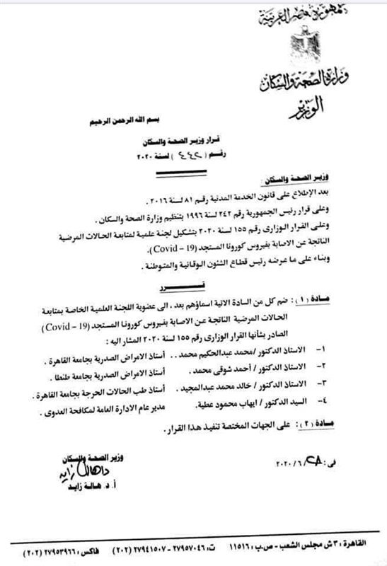 وبحسب القرار تم ضم: الدكتور محمد عبد الحكيم أستاذ الأمراض الصدرية بجامعة القاهرة، والدكتور أحمد شوقي أستاذ الأمراض الصدرية بجامعة طنطا، والدكتور خالد عبد المجيد أستاذ طب الحالات الحرجة بجامعة القاهرة، والدكتور إيهاب عطية مدير الإدارة العامة لمكافحة العدوى بوزارة الصحة.