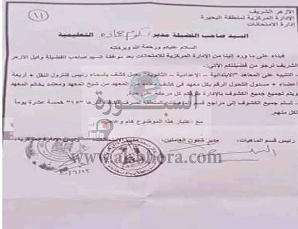 وارسلت مشيخة الازهر خطابا الى جميع ادارات المعاهد الازهرية على مستوى الجمهورية جاء فيه انه بناء على ما ورد من الادارة المركزية للامتحانات بعد موافقة وكيل الازهر يتم التنبيه على جميع المعاهد الابتدائية والاعدادية والثانوية بالاتى: