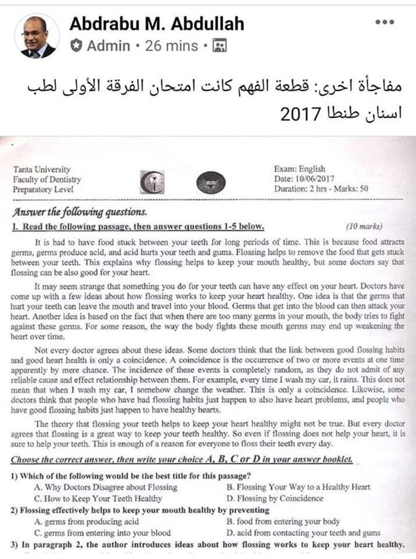 واكد الاستاذ الجامعى في منشور تداوله أولياء الأمور: "قطعة الفهم كانت في امتحان طب أسنان طنطا 2017"، مستنكرًا ما تم في امتحان الشهادة الثانوية.