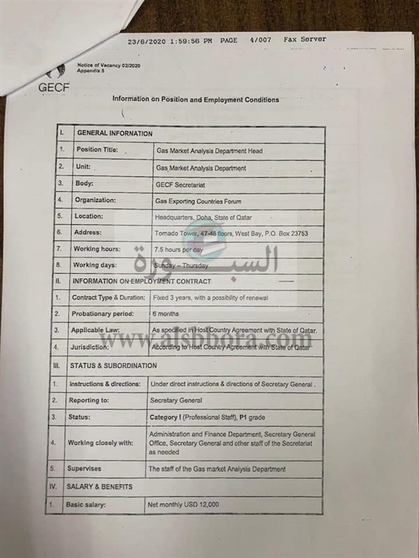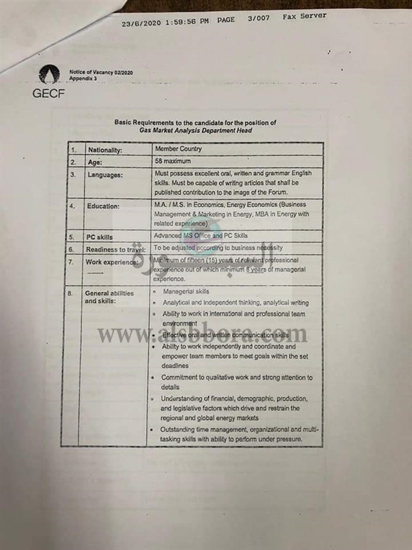 وعن الشروط المطلوبة حسب الاعلان الوارد من الهيئة العامة للبترول بناء على تعليمات المهندس طارق الملا، وزير البترول، ان يرشح رئيس مجلس الإدارة بالشركات قطاع عام او خاص او استثماري مدير ادارة لتحليل سوق الغاز يتبع السكرتير العام للمنظمة مباشرا، وقع على الخطاب مصطفى حسين نائب رئيس الهيئة التنفيذي للشئون التنفيذية.
