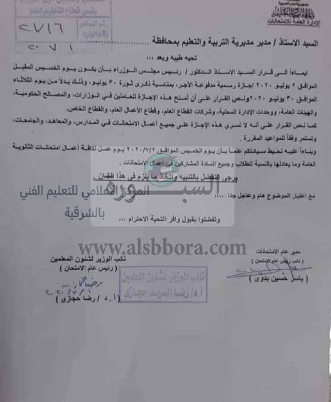 عاجل| التعليم: غدا الخميس يوم عمل لكافة أعمال امتحانات الثانوية العامة وما يعادلها.. "مستند"