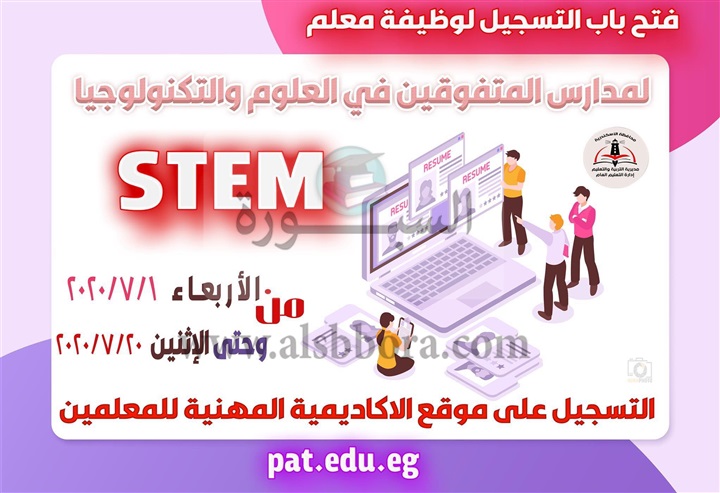 اعلنت وزارة التربية والتعليم عن فتح باب التسجيل لوظيفة معلم لمدارس المتفوقين في العلوم والتكنولوجيا STEM على موقع الاكاديمية المهنية للمعلمين في جميع التخصصات على أن يكون مسجلا في المرحلة الإعدادية أو الثانوية ويفضل بالنسبة للمواد العلمية أن يكون من المدارس الرسمية والمتميزة للغات لمواد الفيزياء والكيمياء والرياضيات والإنجليزي والاحياء والجيولوجيا على أن يبدأ التسجيل اعتبارا من يوم الأربعاء الموافق 1/7/2020 وحتى الإثنين 20/7/2020