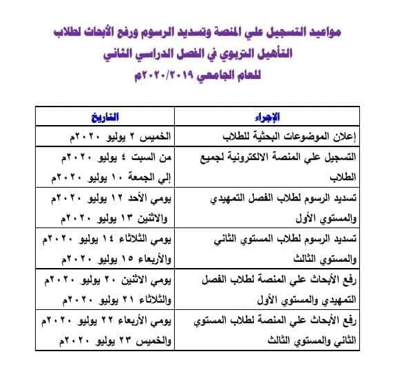 اعلن الدكتور احمد عزيز رئيس جامعة سوهاج بدء التسجيل لطلاب التأهيل التربوي في الفترة من 4 الى 10 يوليو 2020، على ان يتم رفع الابحاث لطلاب الفصل التمهيدي والمستوى الاول يومي 20،21 يوليو الحالي، ويومي 22، 23 من نفس الشهر لطلاب المستويين الثاني والثالث