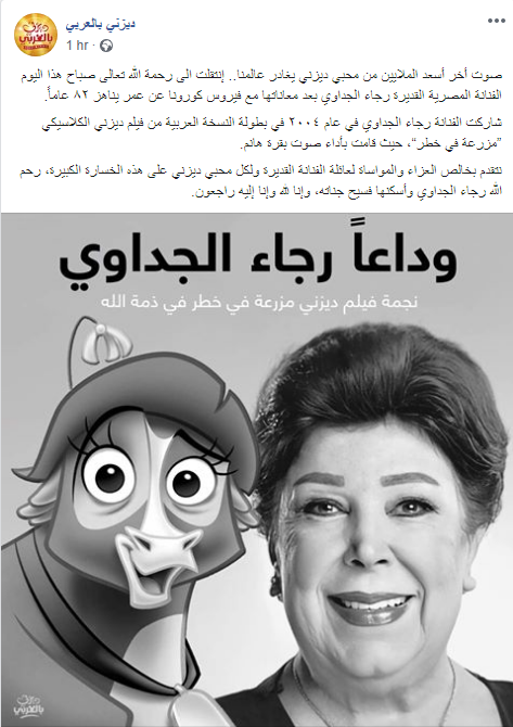 نعت الصفحة الرسمية لديزنى بالعربى على فيسبوك الفنانة الراحلة رجاء الجداوى والتى وافتها المنية صباح اليوم الاحد بعد إصابتها بفيرس كورونا المستجد عن عمر يناهز 82 عاما.
