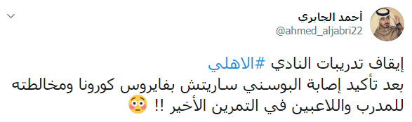 وقال "الجابري" عبر حسابه الشخصي بموقع "تويتر"، أن عدم خوض النادي الأهلي تدريباته أمس الأحد، جاء بسبب اكتشاف حالة كورونا جديدة، داخل صفوف الفريق.
