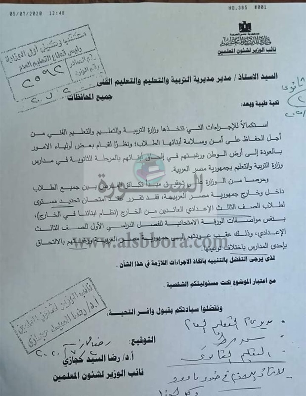 وارسلت الوزارة خطابا الى جميع المديريات التعليمية على مستوى الجمهورية، جاء فيه استكمالا للاجراءات التى تتخذها وزارة التربية والتعليم والتعليم الفنى من اجل الحفاظ على امن وسلامة اينائها الطلاب ونظرا لقيام بعض اولياء الامور بالعودة الى ارض الوطن ورغبتهم فى الحاق ابنائهم للمرحلة الثانوية فى مدارس وزارة التربية والتعليم بجمهورية مصر العربية.
