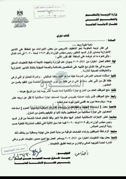 وجاء فى الكتاب الدورى انه فى اطار توجه الحكومة نحو التخفيف التدريجى من بعض الاجراءات مع الحفاظ على التدابير الاحترازية وصدور قرار الدكتور مصطفى مدبولى رئيس الوزراء رقم 1246 لسنة 2020 فى ذات الشأن فقد تقرر الاتى: