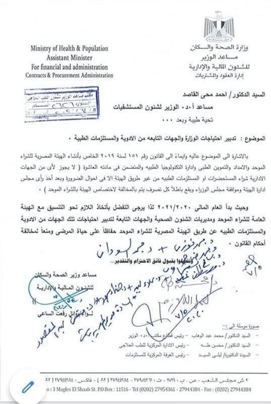 أرسل الدكتور أحمد محيى القاصد، مساعد وزير الصحة لشؤن المستشفيات خطابا إلى جميع المستشفيات بحظر شراء الأدوية والمستلزمات الطبية إلا عن طريق هيئة الشراء الموحد، وفى حالة الضرورة بجب إخطار مجلس ادارة هيئة الشراء الموحد وموافقة مجلس الوزراء.