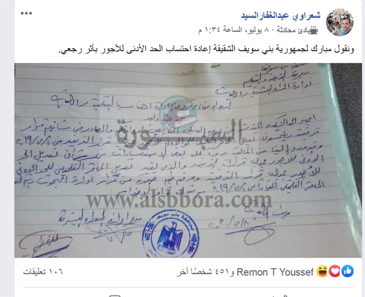 نشر المعلم شعراوي عبدالغفارالسيد، علي جروب معلمين ضد الخصم، علي موقع "فيسبوك"، قرار إعادة احتساب الحد الأدنى للأجور للمعلمين بأثر رجعي الخاص بمحافظة بني سويف.