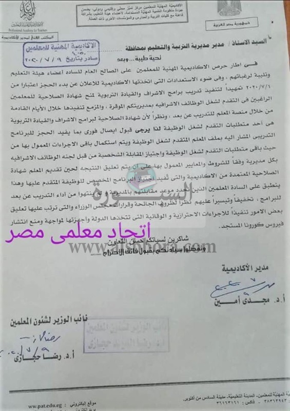 اصدرت الاكاديمية المهنية للمعلمين خطاب للمديريات التعليمية لقبول أوراق المعلمين الراغبين فى التقدم لمسابقة الوظائف الإشرافية والذين حصلوا على تدريب المنصة لتدريبات الإشراف والقيادة التربوية الحالية على أن يتم تقديم إيصال فورى للتقدم للمسابقة الحالية
