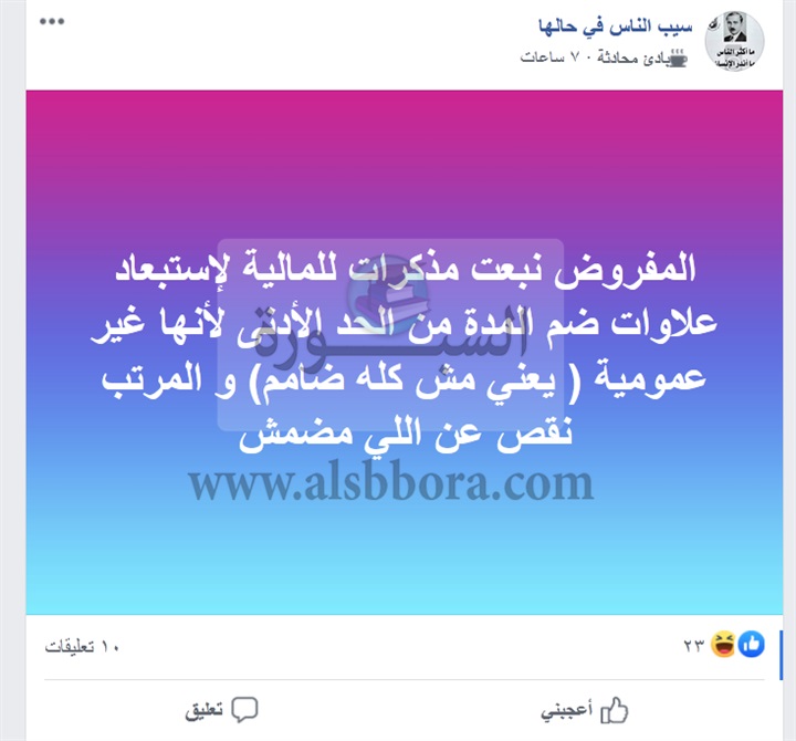 وتضمنت التدوينه، "المفروض نبعت مذكرات للمالية لإستبعاد علاوات ضم المدة من الحد الأدنى لأنها غير عمومية ( يعني مش كله ضامم) و المرتب نقص عن اللي مضمش".