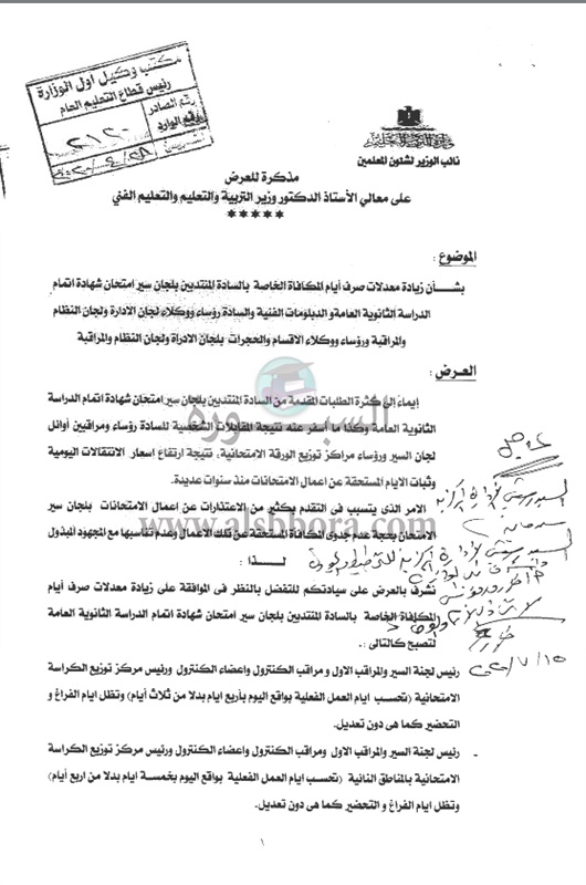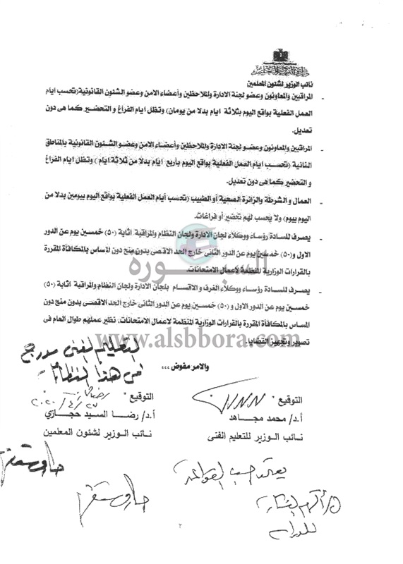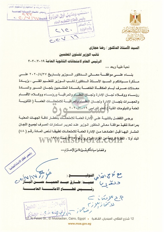وجاء ذلك بناء على موافقة الدكتور الوزير بتاريخ 2020/4/27 والدكتور نائب الوزير بزيادة معدلات صرف ايام المكافاة الخاصة بالسادة المنتدبين بلجان السير والسادة رؤساء ووكلاء لجان الادارة ولجان النظام والمراقبة ورؤساء ووكلاء الاقسام والحجرات بلجان الادارة ولجان النظام والمراقبة للامتحانات العامة "الثانوية العامة والدبلومات الفنية" العام الدراسى 2020/2019