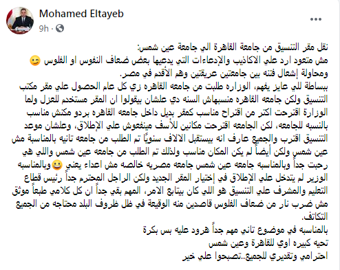 وتابع الدكتور محمد الطيب" علشان موعد التنسيق اقترب والجميع عارف أنه بيستقبل الالاف سنويًا تم الطلب من جامعه ثانية بالمناسبة مش عين شمس ولكن أيضاً لم يكن المكان مناسب ولذلك تم الطلب من جامعة عين شمس واللي هي رحبت جداً وبالمناسبة جامعه عين شمس جامعه مصريه خالصه مش اعداء يعني وبالمناسبة الوزير لم يتدخل علي الإطلاق في اختيار المقر الجديد ولكن الراجل المحترم جداً رئيس قطاع التعليم والمشرف علي التنسيق هو اللي كان بيتابع الأمر ، المهم بقي جداً ان كل كلامي طبعاً موثق مش ضرب نار من ضعاف الفلوس قاصدين منه الوقيعة في ظل ظروف البلد محتاجه من الجميع التكاتف.